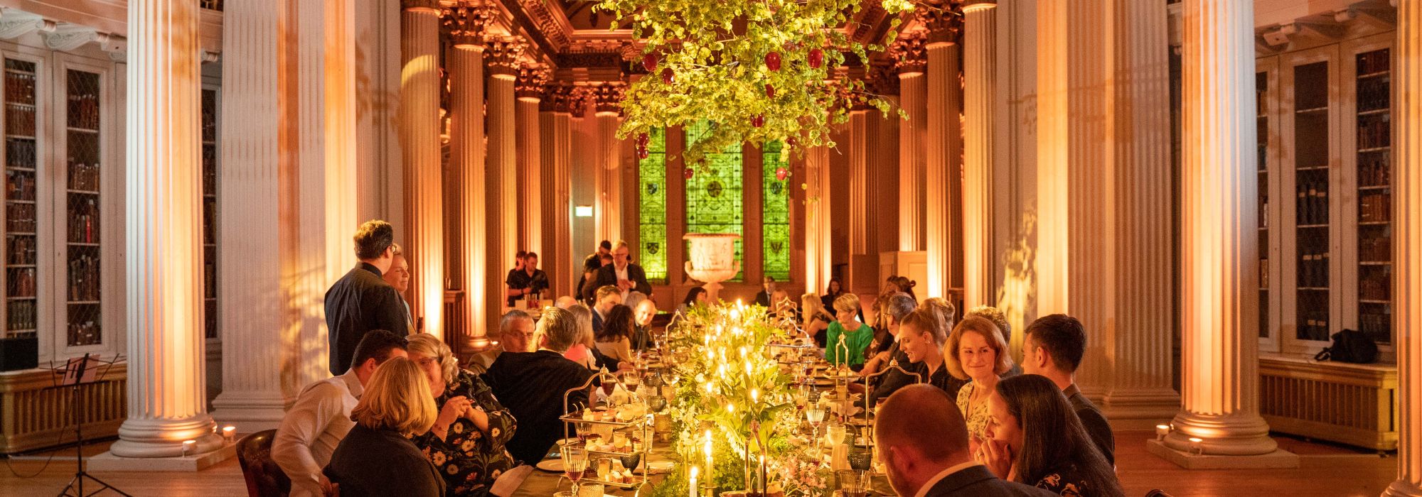 A long feature table in the Upper Library was dressed in rustic green linens, eclectic glassware, and gold cutlery; a sweeping floral arrangement centred the table and a breath-taking floating arrangement gave gravitas and height; emotive lighting changed the ambience throughout the evening.