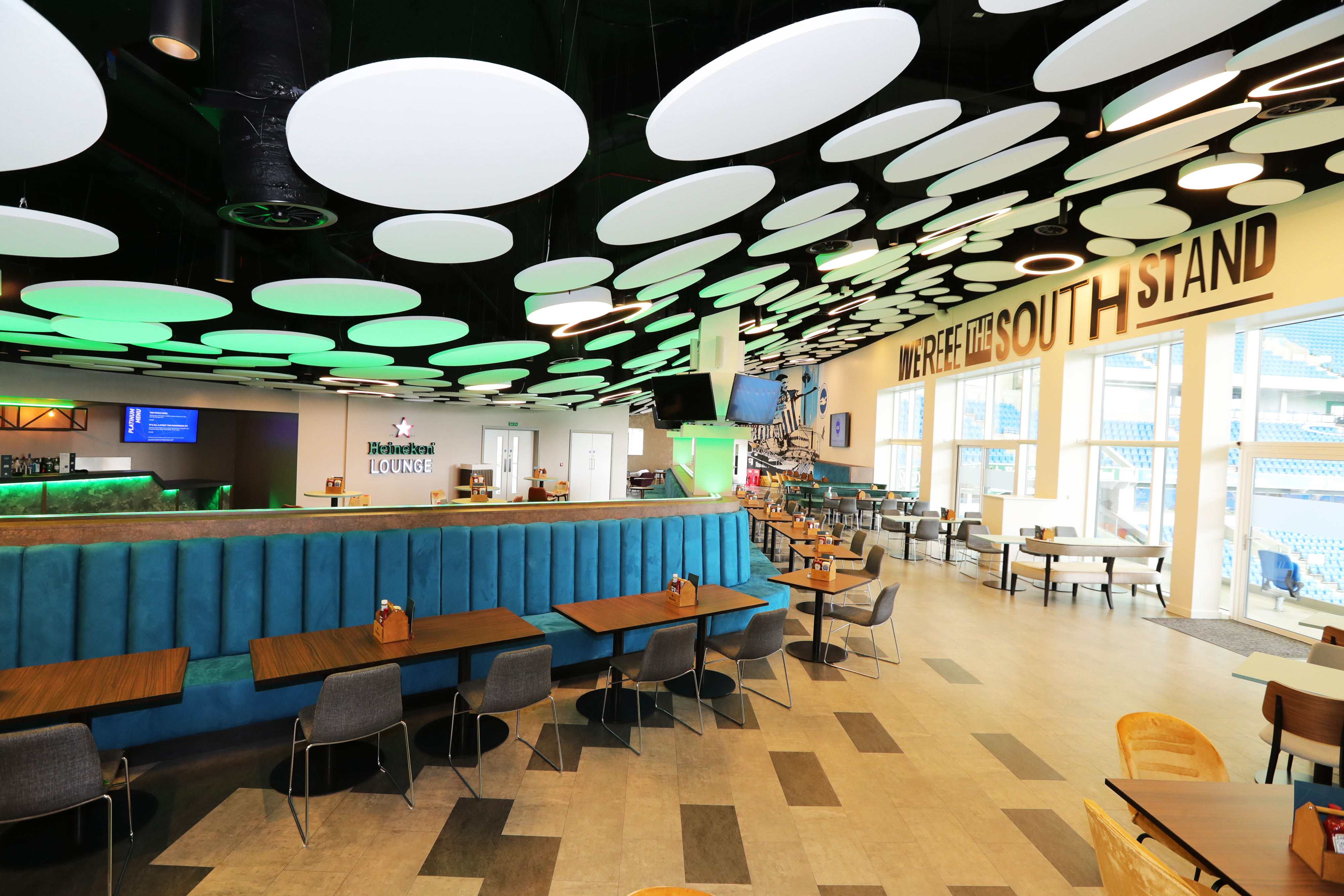 The Heineken Lounge in the South stand is a bright and spacious, and a contemporary open-plan lounge with a towering glass facade overlooking the pitch. With a sweeping ceiling, accent lighting and cool architectural attributes, it lends itself effortlessly to a wide variety of event types and set up styles with a combination of tables and chairs, lounge style seating, two bars and a games area.